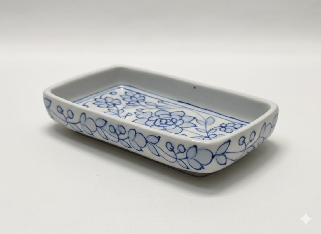 3 Inch Blue Pottery Tray – Jaipur Handcrafted Mini Floral Ceramic Tray | Indian Rectangular Trinket and Condiment Holder