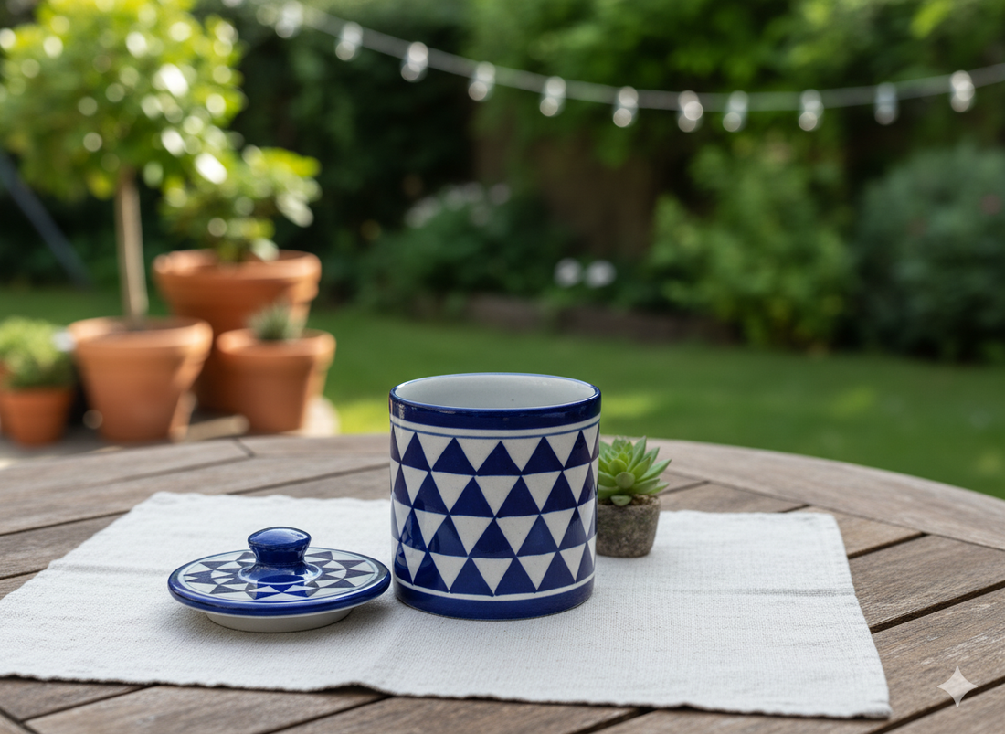 Hand-Painted Jaipur Blue Pottery Jar with Lid (4-Inch) - Indian Ceramic Spice Container, Sugar Pot & Pickle Jar with Geometric Design.