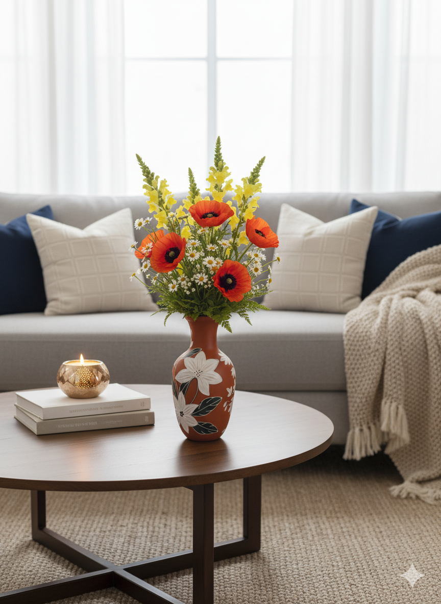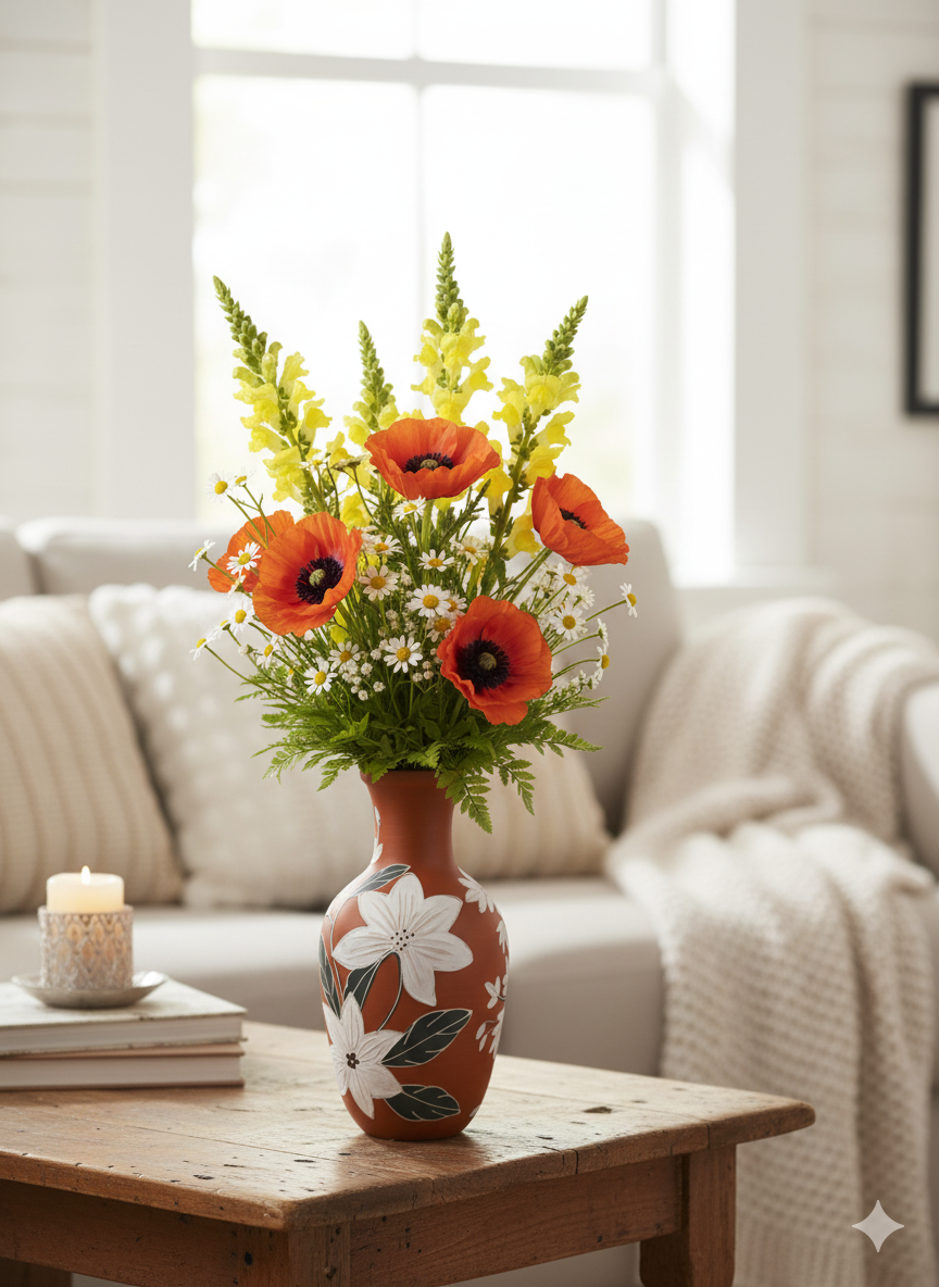 Embrace the perfect blend of rustic charm and modern artistry with our 6-inch hand-painted terracotta vase. Crafted from warm, earthy clay, this piece serves as a beautiful canvas for its stunning, hand-painted floral design. Bold, graphic white blossoms pop against the natural terracotta, connected by elegant dark stems, creating a look that is both organic and chic.